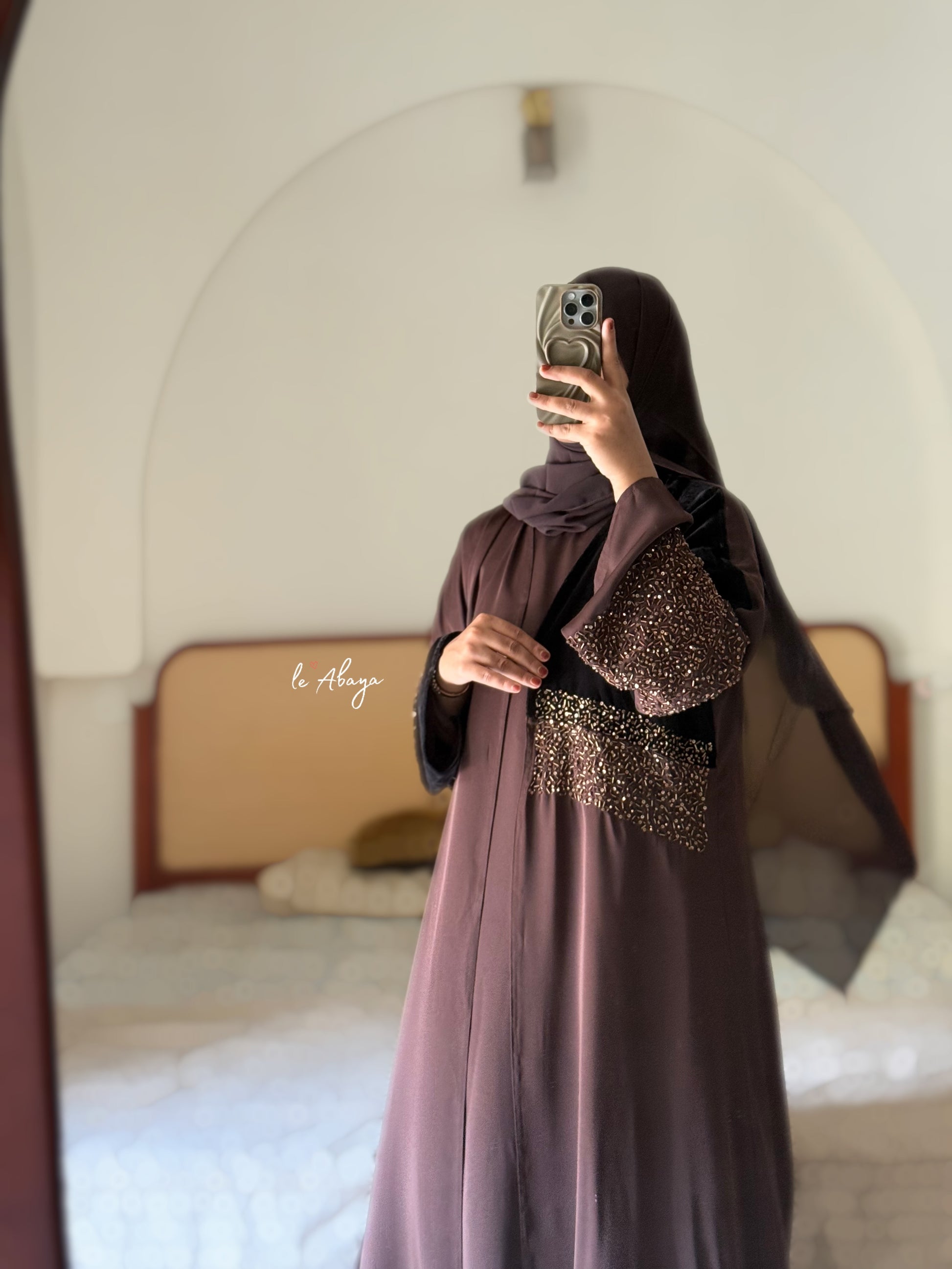 Handworked Abaya with hijab comes with attached Inner Material : Imported Nida model wearing shade : coffee Brown